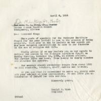 A letter from Chaplain Wynn to Dr. Martin Luther King Jr. on onion paper. The Tuskegee Institute Chapel was in the process of inviting guest speakers to speak to the students, faculty, staff and community. Chaplain Wynn asked if Dr. King could be a guest speaker on 11/11/1956.