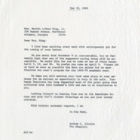A letter from Chaplain Johnson to Coretta Scott King understanding that she will be unable to preach on 11/09/69. Chaplain Johnson provides three other dates in the Spring of 1970 to see if she can preach on the days of April 5th,12th, or 26th.
