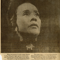 A newspaper article inviting the public to hear Coretta Scott King trying to keep her slain husband's beliefs and ideals alive.