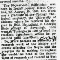 Newspaper obituary article for Monroe N. Work that references his birth place, education, and professional achievements.