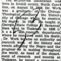 A newspaper obituary article about Dr. Monroe N. Work, a sociologist who founded the Department of Records and Research at Tuskegee University. This article discusses his birthplace, education, and professional achievements throughout his life.