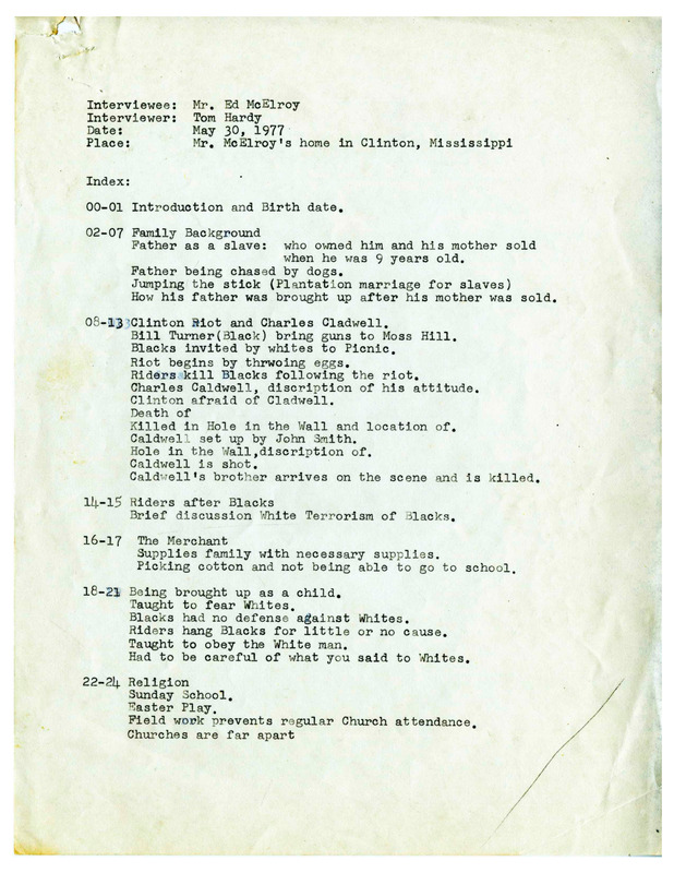 Mr. McElroy was born in 1891 and was a lifelong resident of Clinton. He talks about being the son of a former slave and discusses the oral traditions around the Clinton Riot as well as his education and childhood.