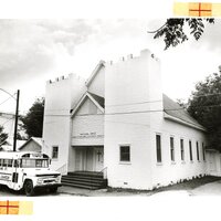 A photograph of the Pentecostal Temple Church of Our Lord Jesus Christ on Kane St. in the Historic Farish Street District. The church bus is parked in front of the entrance. Notation on the photograph indicates the church was built ca. 1935.