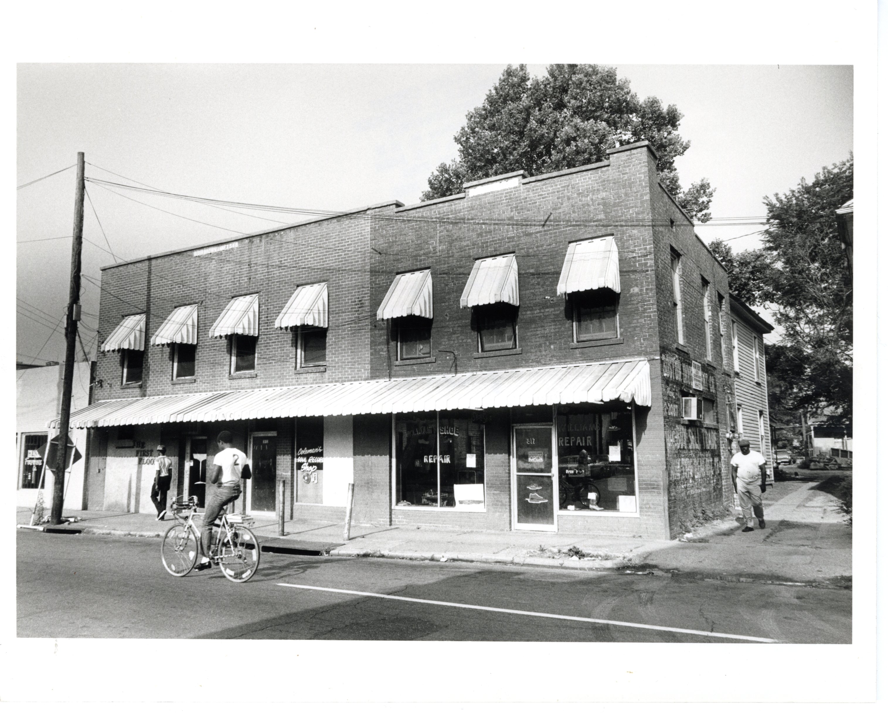 A front-view photograph of businesses on N. Farish Street in the Farish Street Historic District. At the time of the photograph, the businesses were closed and the building was in disrepair.