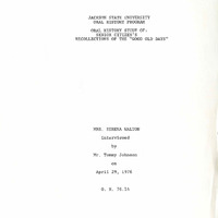 Serena Walton was born in 1908 and moved to Jackson in 1937 after marriage. She recalls the “Good Old Days" as being days of fun, misery, and everyday existence during the 1930's through 1950's. Ms. Walton talks about her younger days and then her time at college during the Great Depression. She also discusses her time teaching in Yazoo County.
