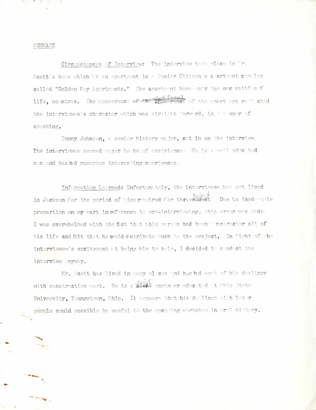 Brown Scott was born in 1912 and came to Jackson in 1951. He recalls the "Good Old Days" as a comparison between the past and present: they were good in the sense that people enjoyed them at the time, but what is good now is quite different. He discusses racial issues he faced in Jackson and being in Europe in the Army for World War II.