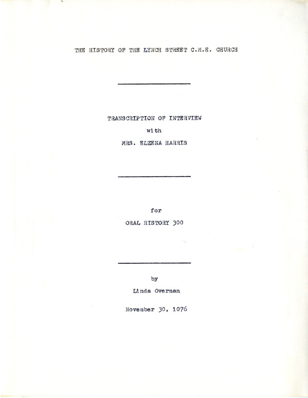 Elzena Harris interviewed by Linda Overman: "The History of the Lynch Street C.M.E. Church," Transcript.