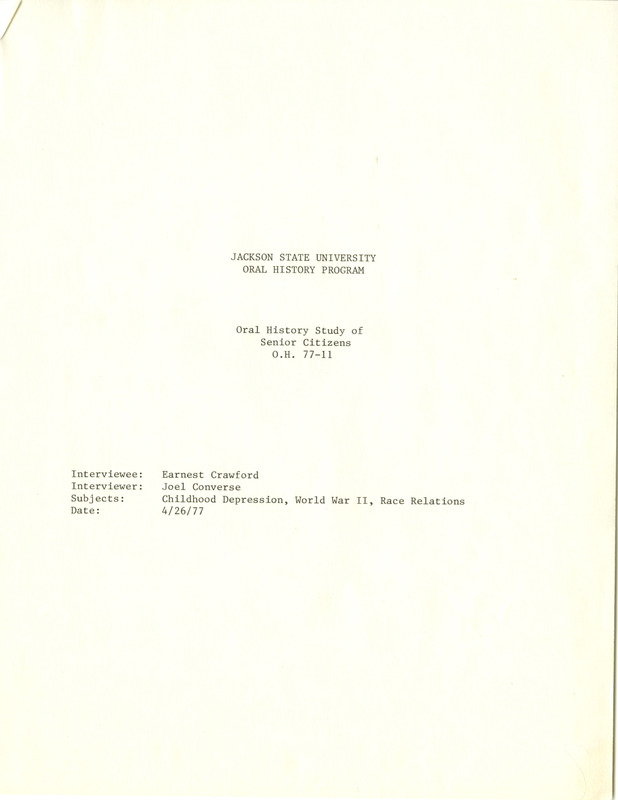 Earnest Crawford moved to Jackson, Mississippi, in 1940 to work for the Coca-Cola company and retired from there in 1965. Mr. Crawford talks about his experience sharecropping and his time spent as an airplane mechanic instructor during World War II. Only a biography, a summary, and an index are included.