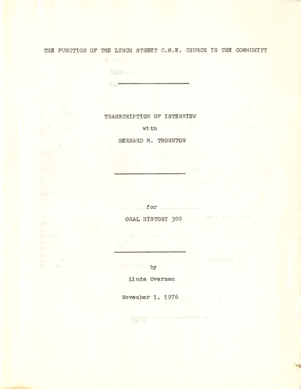 Bernard Thornton interviewed by Linda Overman: "The Function of the Lynch Street C.M.E. Church in the Community," Transcript.