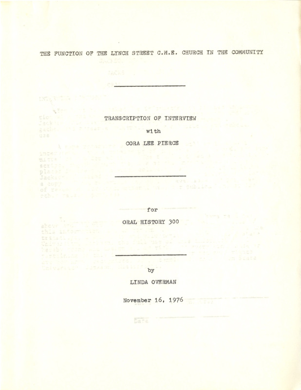 Cora Lee interviewed by Linda Overman: "The Function of the Lynch Street C.M.E. Church in the Community," Transcript.