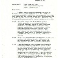 Hodding Carter III, Editor of the Greenville Delta Democrat-Times and board member of Mississippi Action for Progress (MAP), writes to the editors of the New York Times, the Washington Evening Star, and the Washington Post to clear up what he sees as inconsistencies and untruths in reporting about the formation of MAP and its role with Head Start.