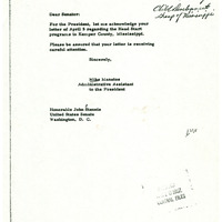 Mike Manatos, Administrative Assistant to President Lyndon Baines Johnson, writes to Senator John Stennis about Head Start in Kemper County, Mississippi. Mr. Manatos writes to acknowledge an April 5th letter from Senator Stennis and assures him the letter is receiving careful attention from the president's office.
