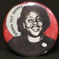 A red and black button with a picture of Fannie Lou Hamer and her name in print. Ms. Hamer was a renowned leader in Mississippi during the Civil Rights Movement. She worked with the Student Nonviolent Coordinating Committee (SNCC) to organize Freedom Summer in 1964 and was also vice-chair of the Mississippi Freedom Democratic Party.