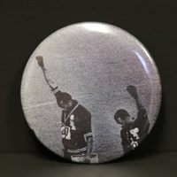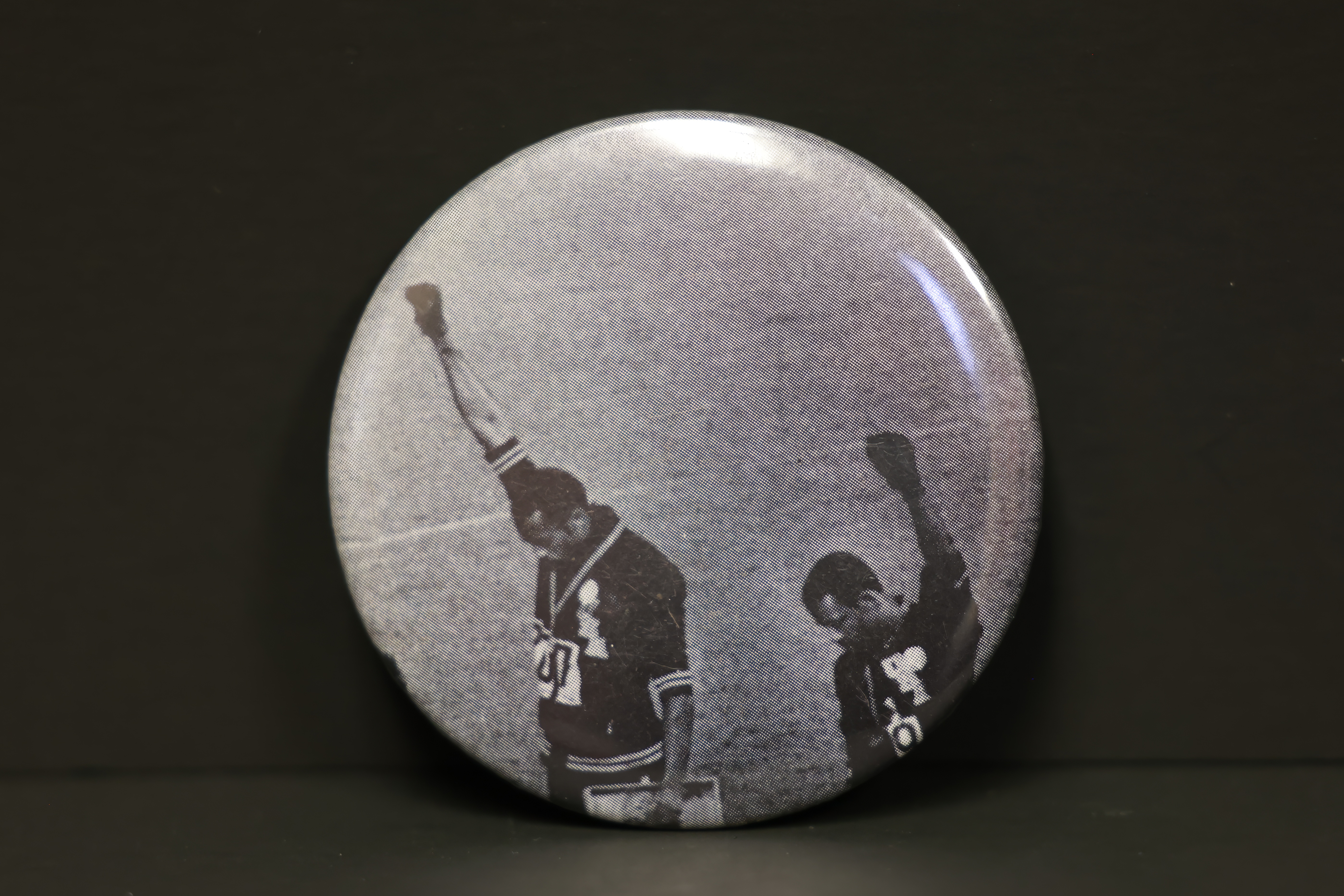 A button with a black and white photo of John Carlos and Tommie Smith giving the Black Power salute at the 1968 Olympics in Mexico City, Mexico after winning bronze and gold medals, respectively, in the 200 meter running event. The salute is considered one of the most overtly political statements in the history of the modern Olympic Games.