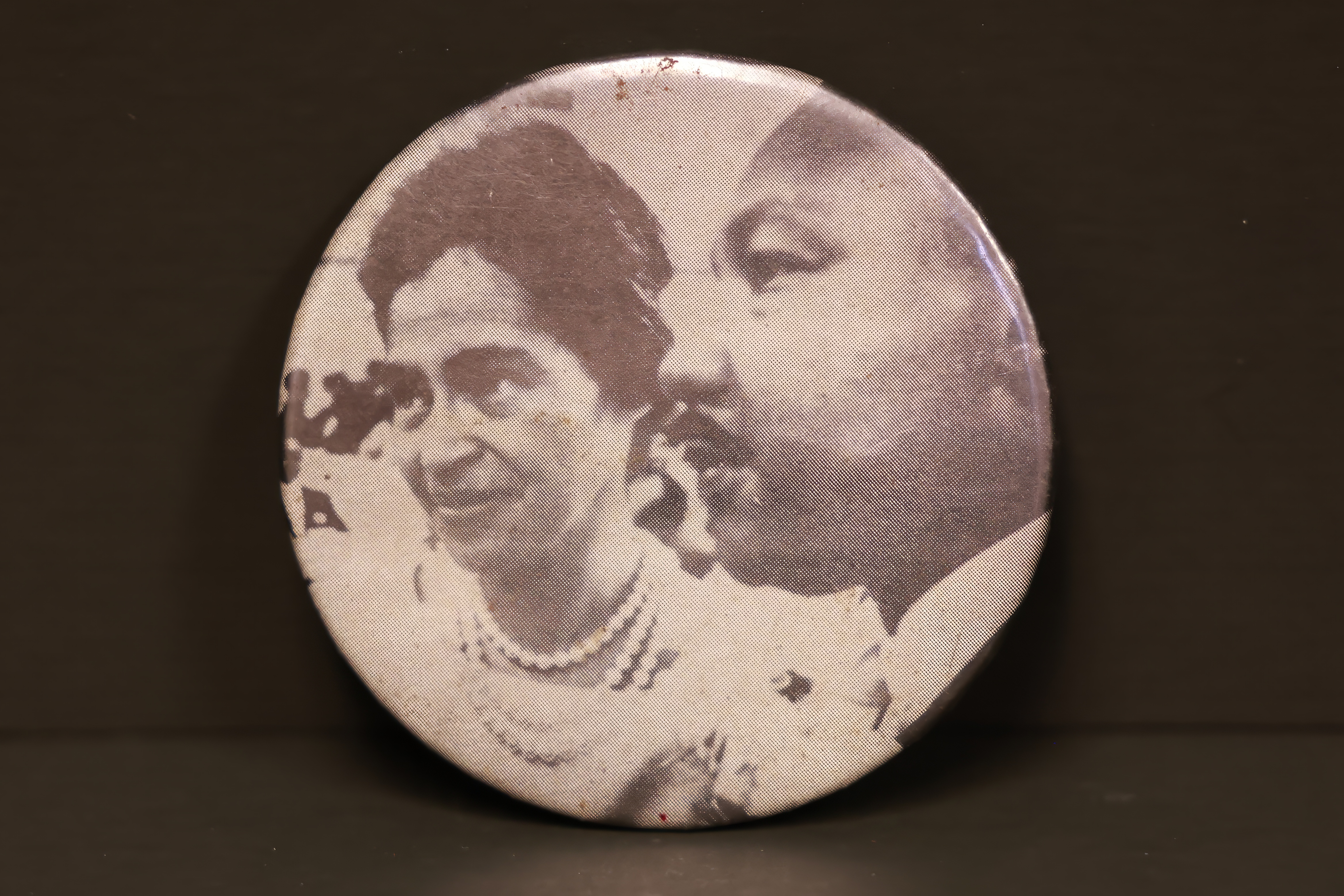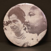 A button with a black and white photo of Dr. Martin Luther King Jr. and Rosa Parks. Dr. King was a co-founder of the Southern Christian Leadership Conference (SCLC) and remained its leader until his death. Rosa Parks’ refusal to give up her seat on a bus in 1955 sparked the Montgomery Bus Boycotts, which were led by Dr. King.