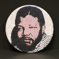 A button with a sketch of a photo of Nelson Mandela. Nelson Mandela was an anti-apartheid activist in South Africa. After being imprisoned for 27 years due to his African Nationalist ideology, he was released in 1990 and led efforts to end apartheid. He was elected president in 1994 in the country's first fully democratic election.