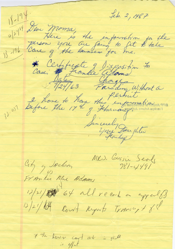 A draft of a letter from Frankye Adams-Johnson (Malika) to "Moma." Frankye Adams-Johnson is requesting her mother to pick up some court documents dating from 1963 and 1964.