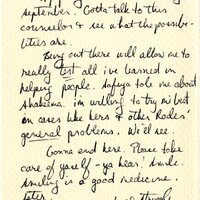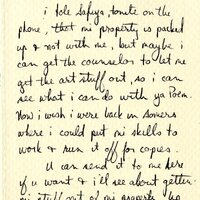 Ashanti Alston, a Black Liberation Army (BLA) member who was imprisoned for 11 years for a robbery, writes about his plans to retrieve Frankye Adams-Johnson (Malika)’s art materials from her property. He tells her that he plans to be out by September and to take care of himself. The letter is dated July 16th with no year specified.