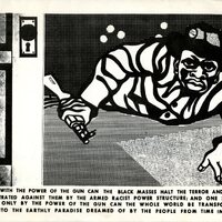 A card from fellow Black revolutionary and friend of Frankye Adams-Johnson (Malika), Curtis. The front of the card is a depiction of a man with a gun and text explaining that only through the gun can freedom be realized by the Black people. On the back of the card he writes “We send you this with revolutionary love and concern, Curtis.”