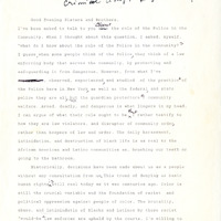 A speech by Frankye Adams-Johnson (Malika) about police in the community. She recalls interactions with the police that she has witnessed and contrasts what the police claim to be with what she sees. There is an outline for a portion of her speech about Black women leading the fight for liberation. She notes that the speech will contain poems.