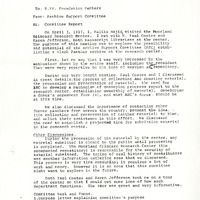 A committee report from Frankye Adams-Johnson (Malika) of the Archive Support Committee to the members of the Black Panther Party Foundation.The report gives details about her visit to the Moorland Spingarn Research Center on April 3, 1987. She met with the manuscript librarians there about the possibility of establishing a Black Panther Archive.