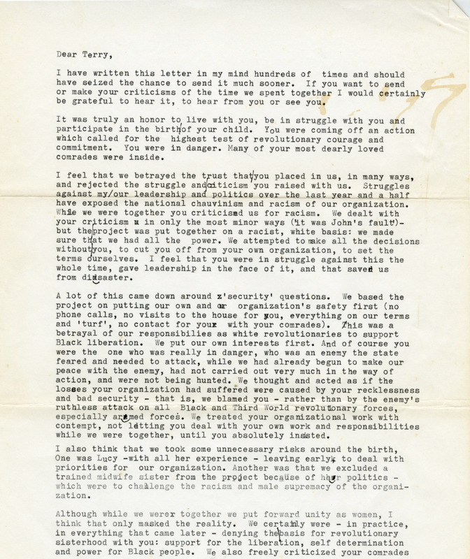Maggie/Jean, a White revolutionary, writes to an unknown Black Liberation movement leader. The author is apologizing for the way White revolutionaries dealt with the struggle for Black liberation during the time they worked together. The writer says that the criticisms of their group exposed the national chauvinism and racism of their organization.