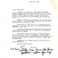 A letter thanking the 15,000 people of the Harlem community and “New York City’s Afrikan community” who came out on March 13, 1981, to show support for the brothers and sisters in Atlanta. The letter also announces a follow up meeting on March 25 with a potluck following on March 28.