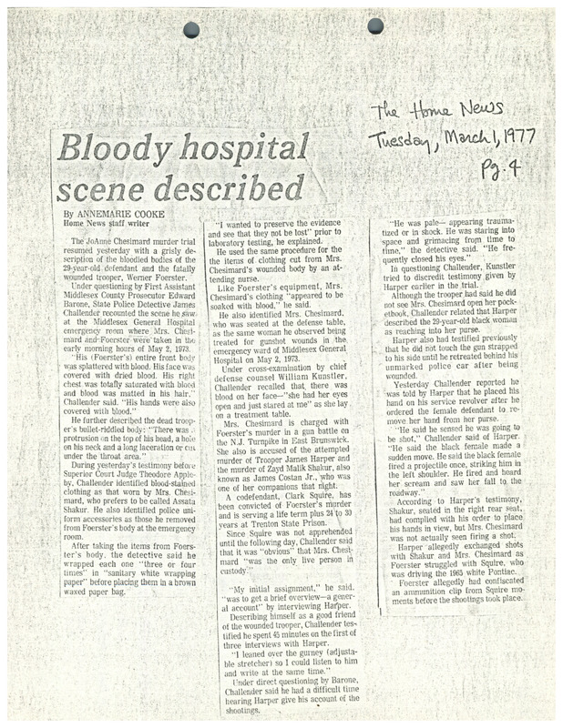 A newspaper article from The Home News about the testimony of State Police Detective James Challender describing what he saw at the emergency room where Assata Shakur (JoAnne Chesimard) and wounded state trooper Werner Foerster were taken after he was fatally shot. Shakur was on trial for the 1973 murder of Foerster.