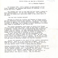 A memo calling for assistance with the funeral for Twymon Myers who was killed by New York City police officers and F.B.I. agents on November 14th, 1973. The unknown author asks the community for donations toward his funeral as a way to show the police that he was a beloved freedom fighter with the support of the people and not a criminal.