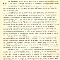 A message from the Black Liberation Army (BLA) to brothers and sisters, comrades and  friends attending a rally. The message briefly outlines the history and tenets of the organization, including taking up arms against the oppressive government as well as combatting ills in the community such as slumlords, drug pushers, and pimps.