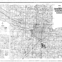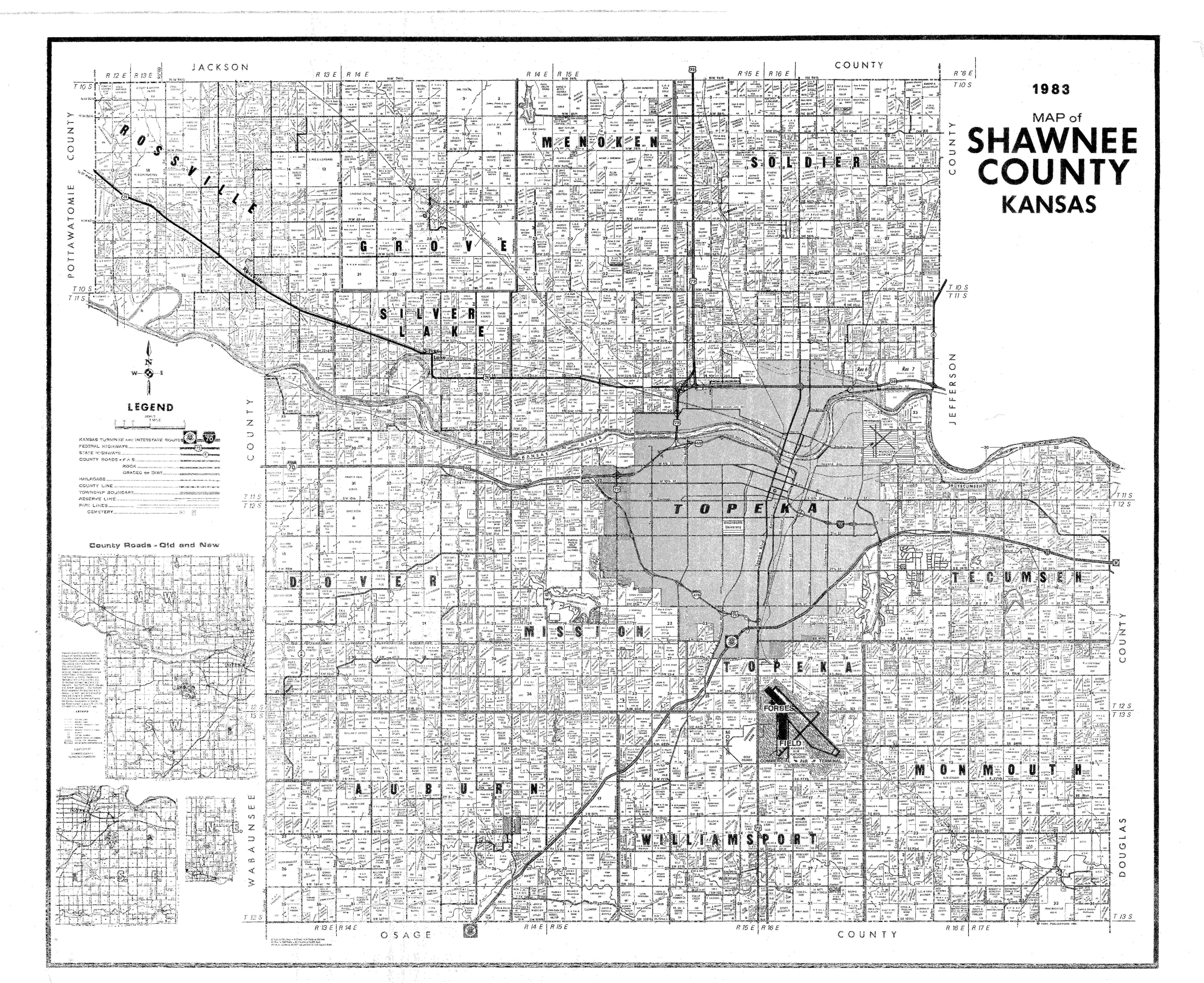 Case Data and Exhibits for Brown III, a relitigation of Brown v. Topeka Board of Education (1954) that corrected resegregation issues caused by open enrollment school choice in 1992. Detailed maps on the left side show County Roads-Old and New in the northwest, northeast, and southeast sections of the county.