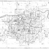 Case Data and Exhibits for Brown III, a relitigation of Brown v. Topeka Board of Education (1954) that corrected resegregation issues caused by open enrollment school choice in 1992. William Lamson handwritten note on top right corner: "1975-6" with several structures on the map hand marked by Lamson.