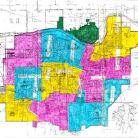 Case Data and Exhibits for Brown III, a relitigation of Brown v. Topeka Board of Education (1954) that corrected resegregation issues caused by open enrollment school choice in 1992. The map shows Proposed Junior High School Attendance Areas for Topeka Public Schools for 1974-1975. William Lamson colored each area with pens and marked the schools.