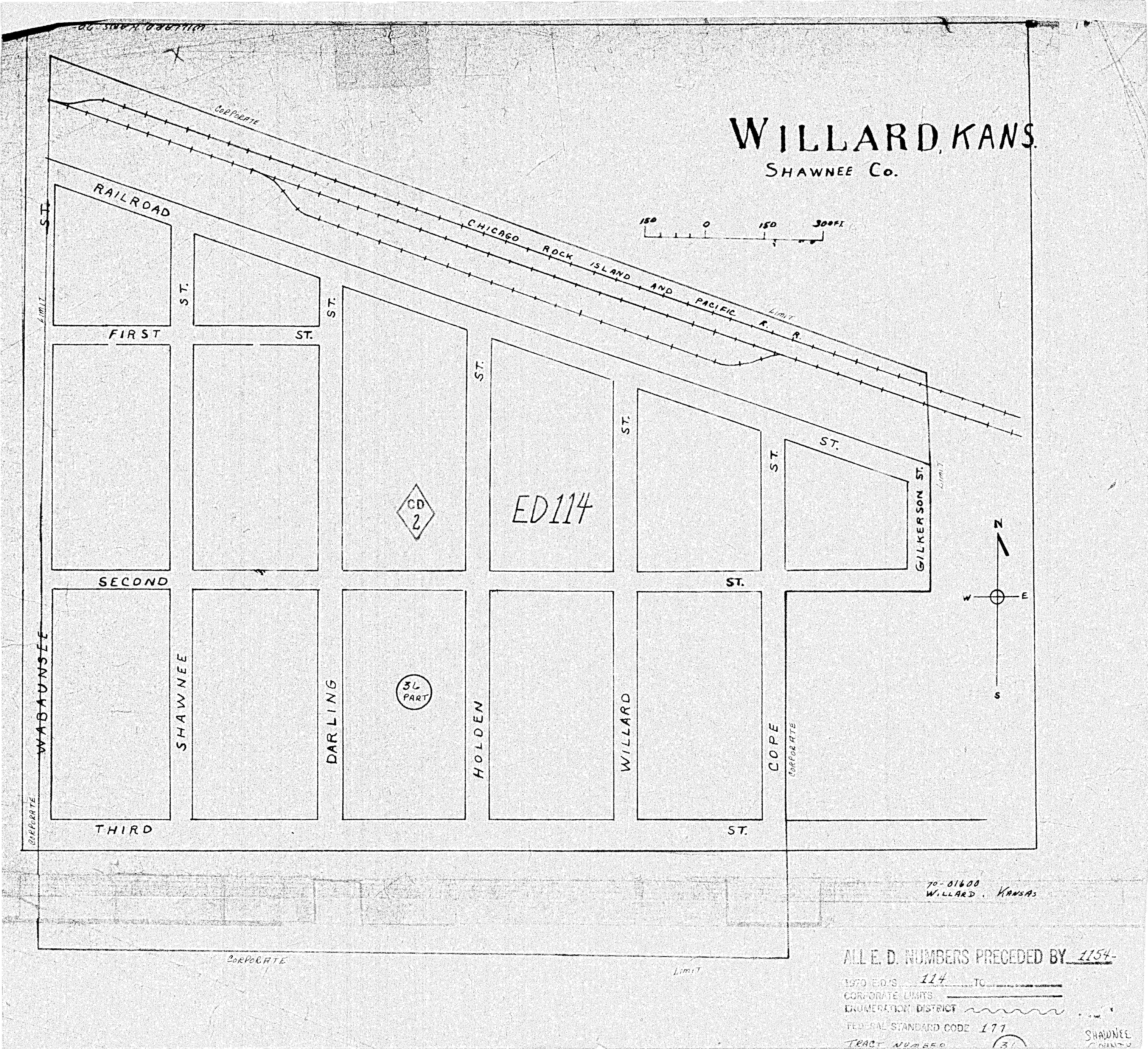 Case Data and Exhibits for Brown III, a relitigation of Brown v. Topeka Board of Education (1954) that corrected resegregation issues caused by open enrollment school choice in 1992. Map of Willard Shawnee County, Kansas, showing school district Ed. 114.