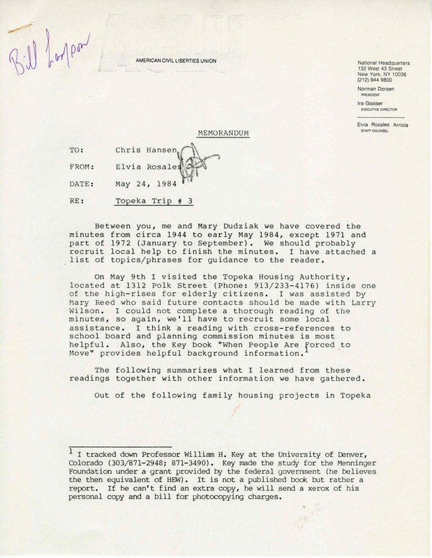 Case Data and Exhibits for Brown III, a relitigation of Brown v. Topeka Board of Education (1954) that corrected resegregation issues caused by open enrollment school choice in 1992. A 1984 ACLU memo titled "Topeka Trip #3” about the racial makeup of different Topeka communities. Annexation data, map legend, and notes by William Lamson.