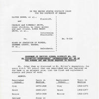 Case Data and Exhibits for Brown III, a relitigation of Brown v. Topeka Board of Education (1954) that corrected resegregation issues caused by open enrollment school choice in 1992. A document submitted by the defense team concerning a plaintiff question about school closures and replacement schools, with handwritten notes from William Lamson.