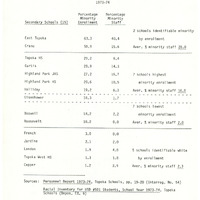 Case Data and Exhibits for Brown III, a relitigation of Brown v. Topeka Board of Education (1954) that corrected resegregation issues caused by open enrollment school choice in 1992. Charts comparing percentages of minority and white enrollment to minority and white staff members in Topeka, Kansas, schools from the 1973 to 1984 school years.