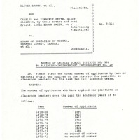 Case Data and Exhibits for Brown III, a relitigation of Brown v. Topeka Board of Education (1954) that corrected resegregation issues caused by open enrollment school choice in 1992. Document to the plaintiffs from the defense in response to a request for the number of applicants by race or national origin for district jobs over the past decade.