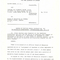 Case Data and Exhibits for Brown III, a relitigation of Brown v. Topeka Board of Education (1954) that corrected resegregation issues caused by open enrollment school choice in 1992. Document to the plaintiffs from the defense in response to a question about policies concerning segregation of teaching assignments based on race or national origin.