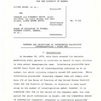 Case Data and Exhibits for Brown III, a relitigation of Brown v. Topeka Board of Education (1954) that corrected resegregation issues caused by open enrollment school choice in 1992. Document to the plaintiffs from the defense in response to the first set of evidence discovery questions. The defense lists their answers as well as their objections.