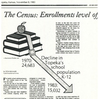 A newspaper article from the Topeka Capital-Journal about the decline in Topeka's K-12 public school population between 1970 and 1983. By 1983, those numbers had started to level out, but there were still recommendations to close 12 to 14 of the district’s 26 public elementary schools based on declining enrollment and building conditions.