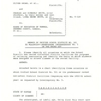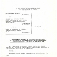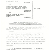 Case Data and Exhibits for Brown III, a relitigation of Brown v. Topeka Board of Education (1954) that corrected resegregation issues caused by open enrollment school choice in 1992. Document to the plaintiffs from the defense in response to questions about overcrowded schools in the district and a definition of the word capacity.