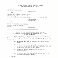Case Data and Exhibits for Brown III, a relitigation of Brown v. Topeka Board of Education (1954) that corrected resegregation issues caused by open enrollment school choice in 1992. Document to the plaintiffs from the defense in response to questions about optional attendance zones, including why they exist, how they are evaluated, and more.