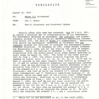 A Memorandum from ACLU Attorney Jon C. Dubin to Brown III Co-Counsel With an Update on Evidence Discovery for the Trial, August 22, 1983.
