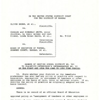 Case Data and Exhibits for Brown III, a relitigation of Brown v. Topeka Board of Education (1954) that corrected resegregation issues caused by open enrollment school choice in 1992. Document to the plaintiffs from the defense answering questions about the separation and segregation of teachers and other employees on the basis of race.