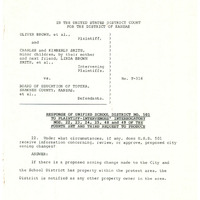 Case Data and Exhibits for Brown III, a relitigation of Brown v. Topeka Board of Education (1954) that corrected resegregation issues caused by open enrollment school choice in 1992. Document to the plaintiffs from the defense answering questions about proposed city zoning changes and the district’s level of involvement with those decisions.