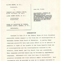 Case Data and Exhibits for Brown III, a relitigation of Brown v. Topeka Board of Education (1954) that corrected resegregation issues caused by open enrollment school choice in 1992. Plaintiff attorney’s response to the defense team’s first set of questions directed from the defendants associated with the Kansas State Board of Education.