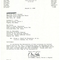 Case Data and Exhibits for Brown III, a relitigation of Brown v. Topeka Board of Education (1954) that corrected resegregation issues caused by open enrollment school choice in 1992. Full list of defense witnesses that can be called during trial. A cover letter from defense attorney K. Gary Sebelius requesting the addition of two more names.