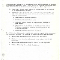 Case Data and Exhibits for Brown III, a relitigation of Brown v. Topeka Board of Education (1954) that corrected resegregation issues caused by open enrollment school choice in 1992. A summary of a preliminary plan presented at a Topeka School Board meeting on April 30, 1974. The plan includes school closures, student reassignment, and more.