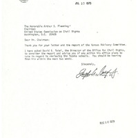 A letter from Joseph A. Califano Jr. of the United States Department of Health, Education, and Welfare to Chairman of the United States Commission on Civil Rights Arthur S. Flemming, July 30, 1979.